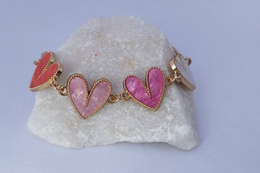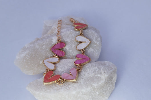 Nuestra pulsera de corazones combina tonos rosa, fucsia y blanco con un delicado acabado dorado, creando un diseño romántico y elegante. Perfecta para usar sola o combinar con otros accesorios de tu colección.