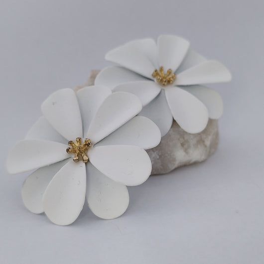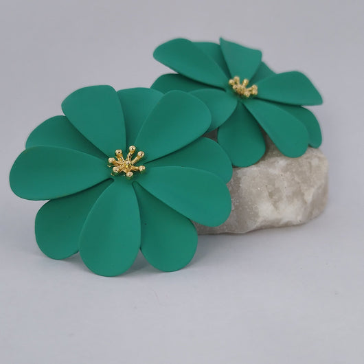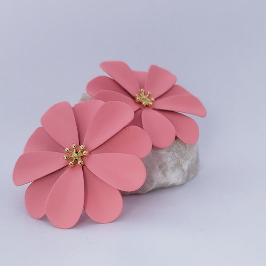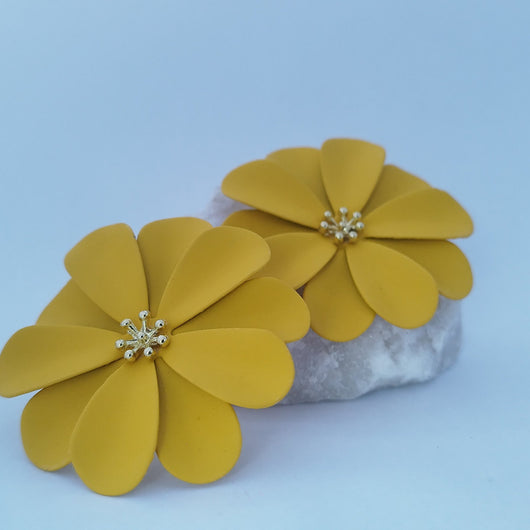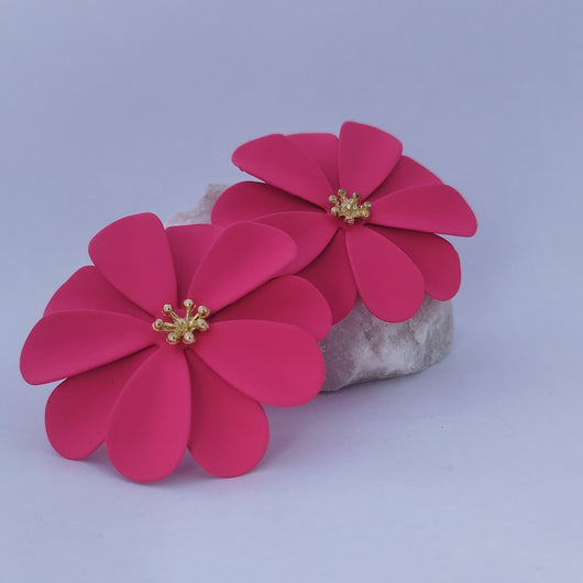 Luce un estilo fresco, alegre y lleno de color con nuestros aretes en forma de flor grande. Su diseño en pétalos amplios con detalle dorado en el centro los convierte en el accesorio ideal para destacar cualquier outfit, ya sea casual o elegante.